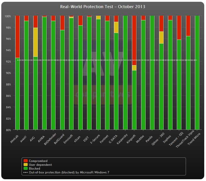 AVG en Qihoo misten 2 tot 3% van de virussen en Kingsoft deed het ronduit slecht met bijna 9% missers. En dat is zelfs minder goed dan de baseline bescherming, bestaande uit een volledig gepatchte Windows 7 met Microsoft Security Essentials (MSE) als virusscanner. MSE haalde een score van 92,2%, wat betekent dat zo'n veertig virussen niet gestopt werden.