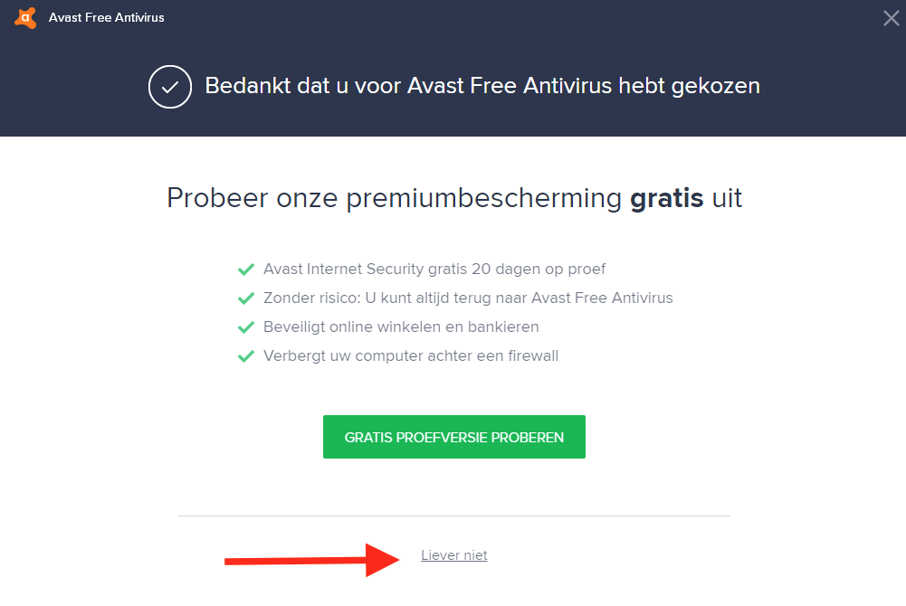 Avast Free Antivirus is echt gratis. Alleen tijdens de registratie probeert de producent je te verleiden om de - uitgebreidere - betaalde versie te kiezen. Dit is niet nodig, omdat de gratis versie van Avast ook prima bescherming biedt. Let dus goed op tijdens de registratie/activatie!