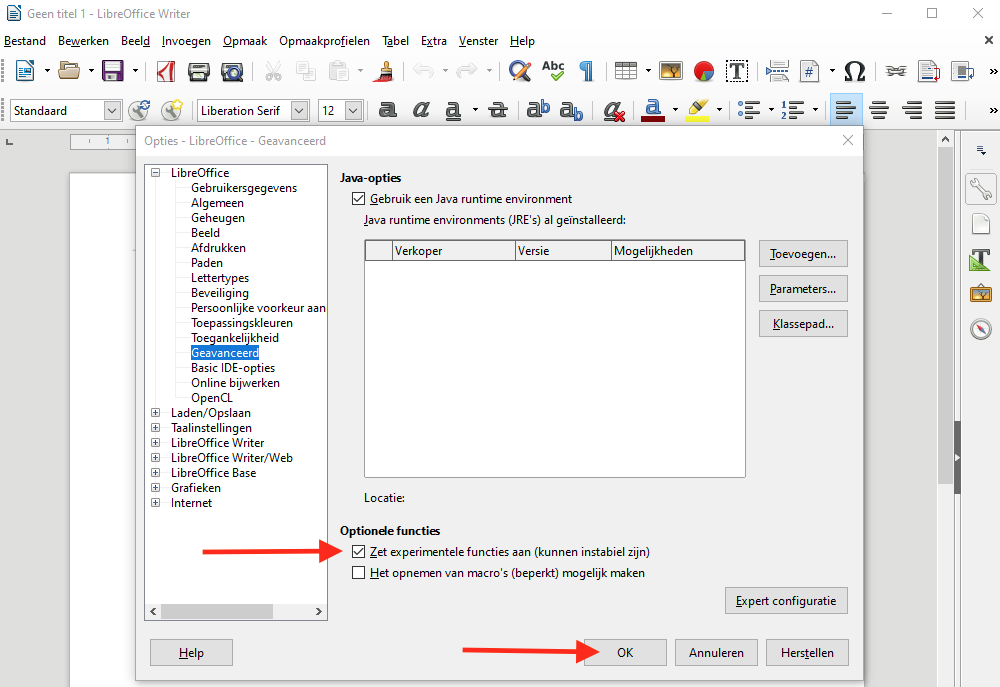 1. Ga in LibreOffice naar menu Extra | Opties | LibreOffice - Geavanceerd en zet onder Optionele functies een vinkje bij Zet experimentele functies aan. Deze kunnen nog instabiel zijn waarschuwt LibreOffice. Klik vervolgens OK en herstart LibreOffice als daarom gevraagd wordt.