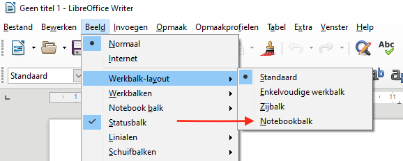2. Ga nu naar het menu Beeld | Werkbalk-layout en zet een vinkje bij Notebookbalk.
