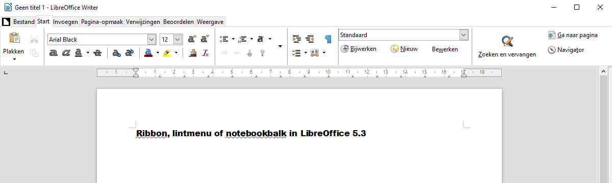 Hierna zie je het lint-menu/ribbon, dat blijkbaar Notebookbalk genoemd wordt, verschijnen in LibreOffice (klik op de afbeelding voor groter):