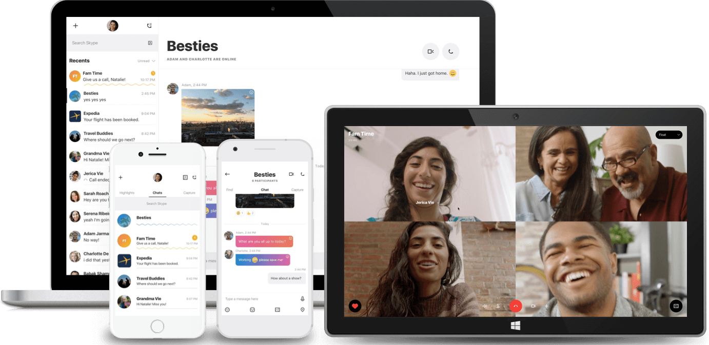 Het ontwerp van Skype is geheel vernieuwd, met meer wit en een rustigere opmaak (klik op afbeelding voor groter). Verder komt chat centraal te staan in Skype, net als het delen van je favoriete foto's en momenten. Zo kun je gif'jes en YouTube-filmpjes zoeken om toe te voegen aan je bericht. Skype lijkt met deze nadruk op chatten meer de kant van WhatsApp en SnapChat op te gaan. Video- en audiobellen blijft ook mogelijk natuurlijk.