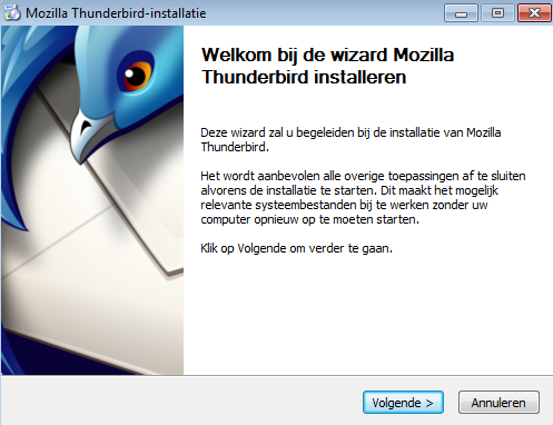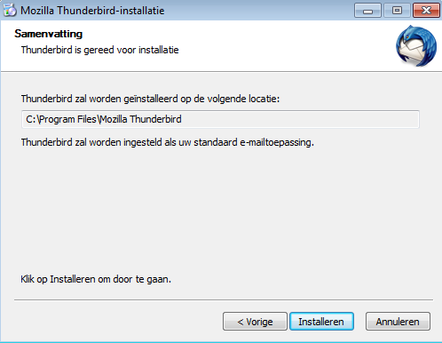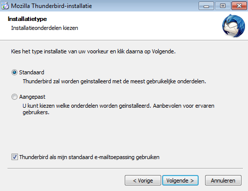 3. Kies de standaard installatie, laat het vinkje staan als je Thunderbird als standaard mailprogramma wilt gebruiken en klik Volgende