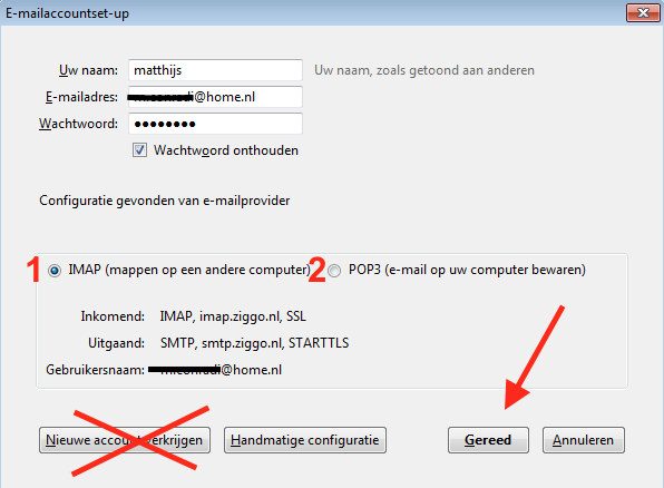 10. Daarna zal Thunderbird proberen om de juiste serverinstellingen voor je mail-account in te vullen. Voor grote providers als Ziggo en KPN lukt dit meestal wel. Je kunt nog kiezen voor IMAP (1), wat meestal aan te raden is of POP3 (2). Als alles goed is klik je Gereed. Als het Thunderbird niet lukt zul je zelf de Handmatige configuratie moeten invullen.