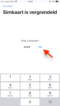 Vanaf iOS 12 ziet het ontgrendelen van je sim-kaart er anders - en logischer - uit, je tikt je pincode in en klikt OK (zie afbeelding hiernaast). Standaard is de code vaak 0000.