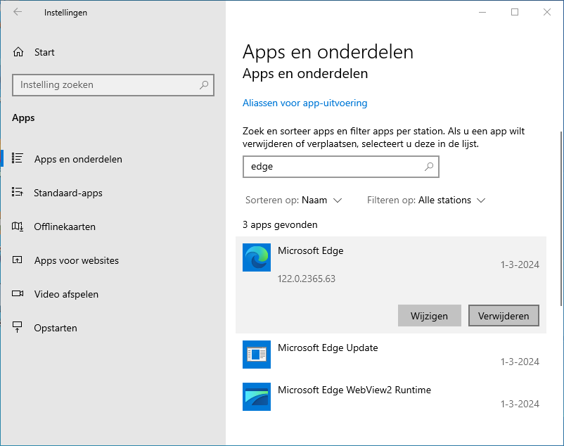 Microsoft Edge wordt nu verwijderd uit Windows 10. Mocht je spijt hebben dan kun je Edge altijd weer opnieuw installeren. Edge Update en Edge WebView2 Runtime kun je niet verwijderen.