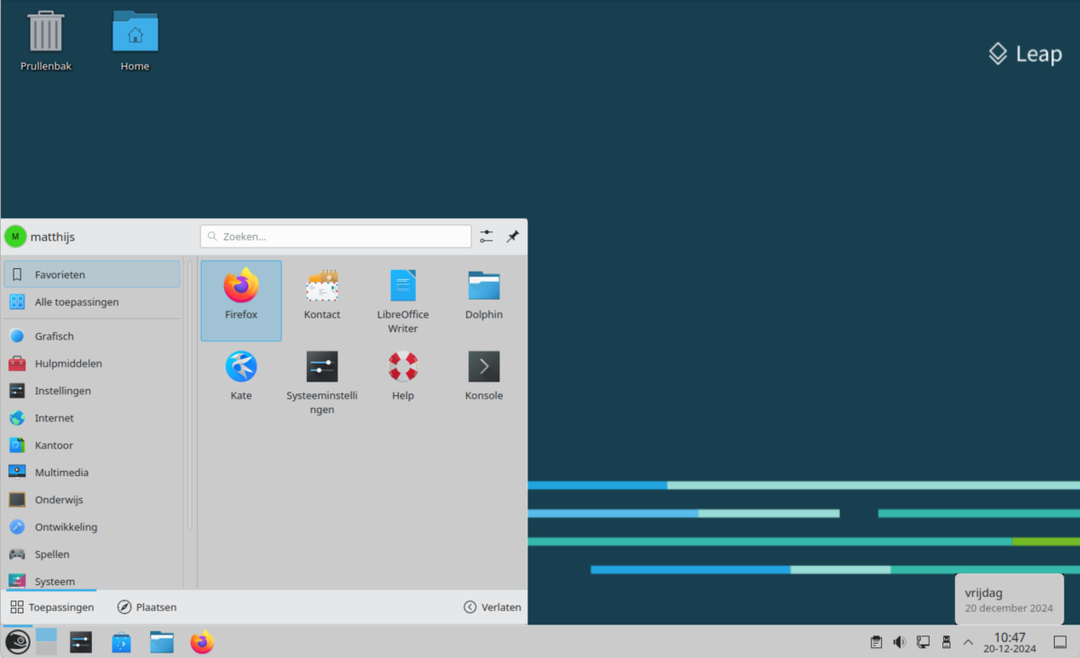Nu kun je elke Linux distibutie meestal vrij makkelijk aanpassen, en zelfs voor andere bureaubladomgevingen kiezen, maar om te beginnen is dit de duidelijkste indeling om wat overzicht te krijgen.
