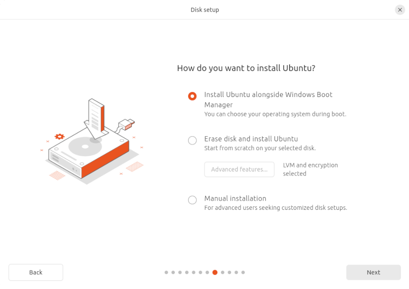 Pas verderop in de installatie procedure wordt de keuze aangeboden om Linux naast Windows te installeren. Even doorbijten dus.