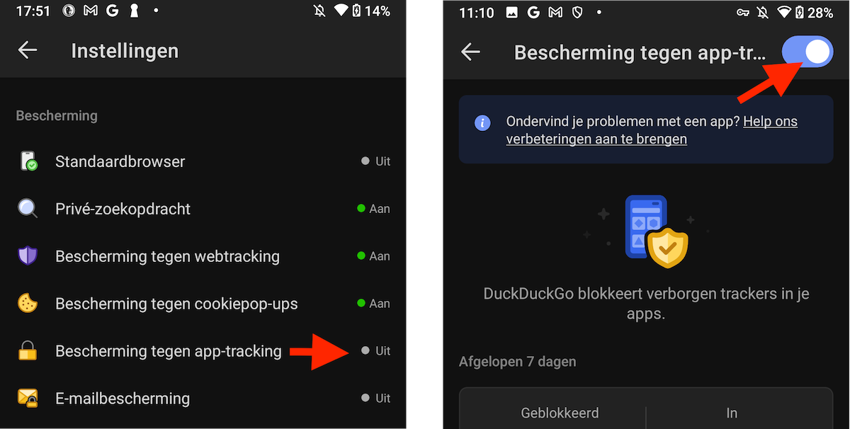 b) Ga in DuckDuckGo op Android naar driepuntjes-menu | Instellingen | Bescherming tegen app-tracking en schakel deze functie in door de schakelaar aan te zetten. Daarna wordt gevraagd of je een (lokale) VPN-verbinding wilt opzetten. Dat sta je toe.