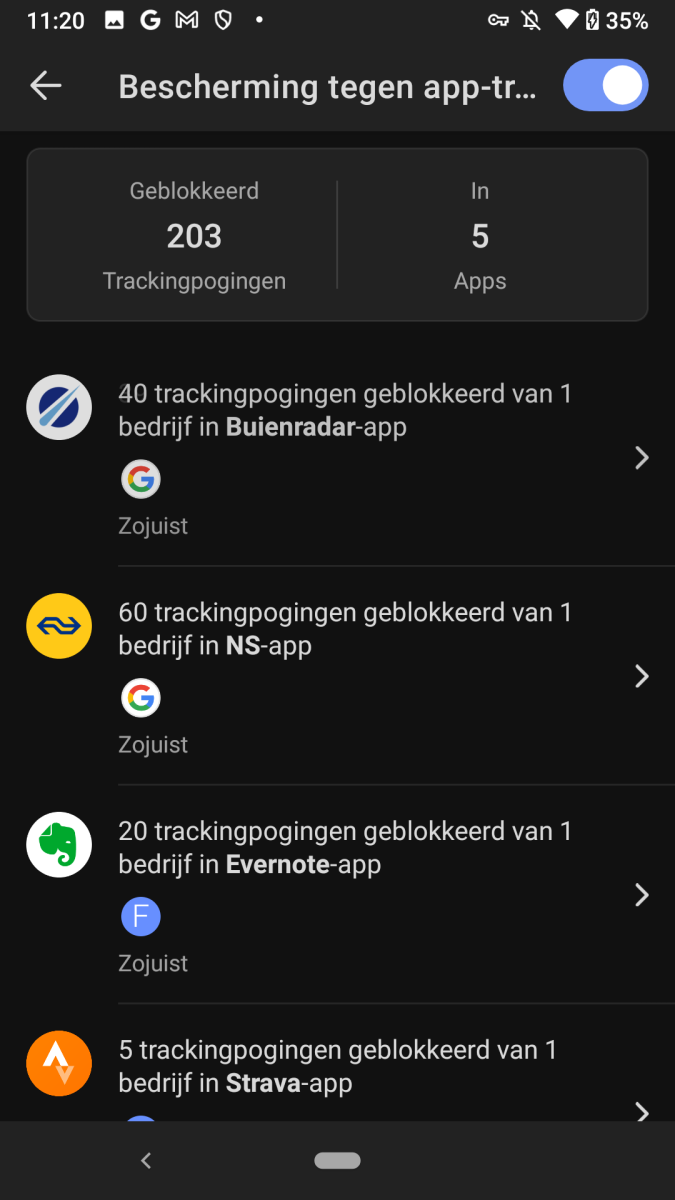 Bijna alle apps van commerciële partijen op je Android-telefoon proberen je te volgen. Of het nu Buienradar, NS, Evernote, 9292, Ziggo GO, KPN, Strava en nog veel meer apps, betreft. Volgens DuckDuckGo volgen wereldwijd 96 van de 100 populairste apps je. Dat zal in Nederland wel niet heel anders zijn. En van de gegevens die de apps verzamelen wordt 87% naar Google gestuurd en 68% naar Facebook. Dat zijn dus de grootste data-slurpers die jouw privé-gegevens willen weten.