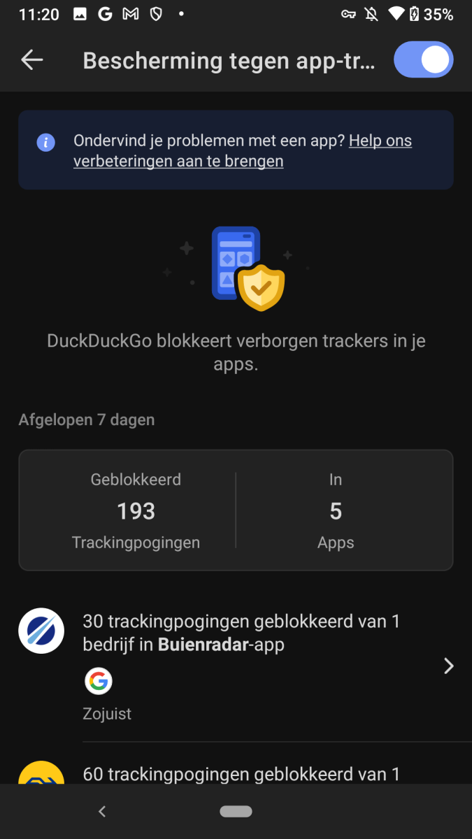 Ik heb jullie tip om DuckDuckGo te installeren opgevolgd en de functie op tracking te blokkeren aangezet. Ik vind het schokkend om te zien hoeveel trackpogingen er geblokkeerd zijn. Jullie spreken zelf van wel meer dan 1000 per dag, mijn toestel zit na drie dagen inmiddels aan 7000 per dag. Ik ondervind geen problemen met de andere apps door deze blokkering.