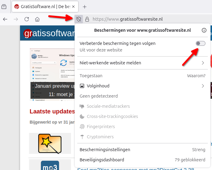 Je kunt overigens nog wel per site de Verbeterde bescherming tegen volgen uitzetten, mocht een website niet goed werken. Je klikt dan op het schildje aan het begin van de adresbalk in Firefox en schakelt daarna - al dan niet tijdelijk - de Verbeterde bescherming tegen volgen uit.