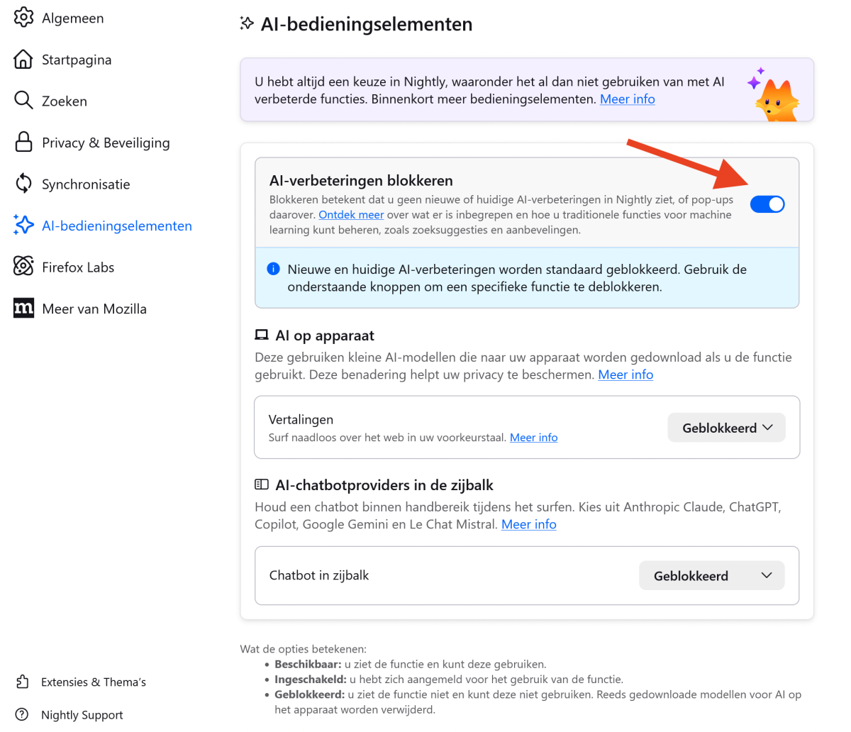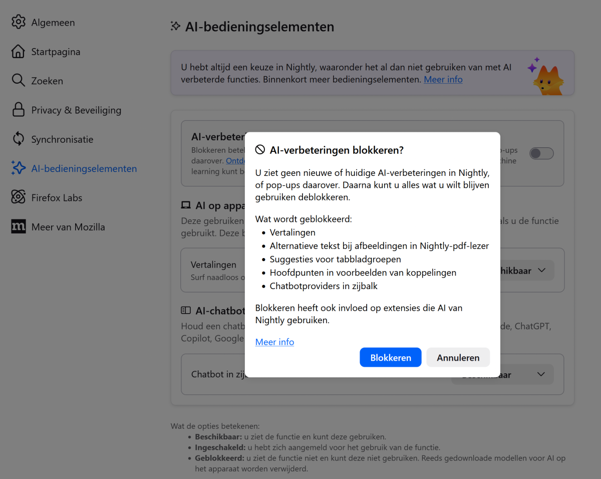Het blokkeren van AI in de testversie (Nigthly) van Firefox