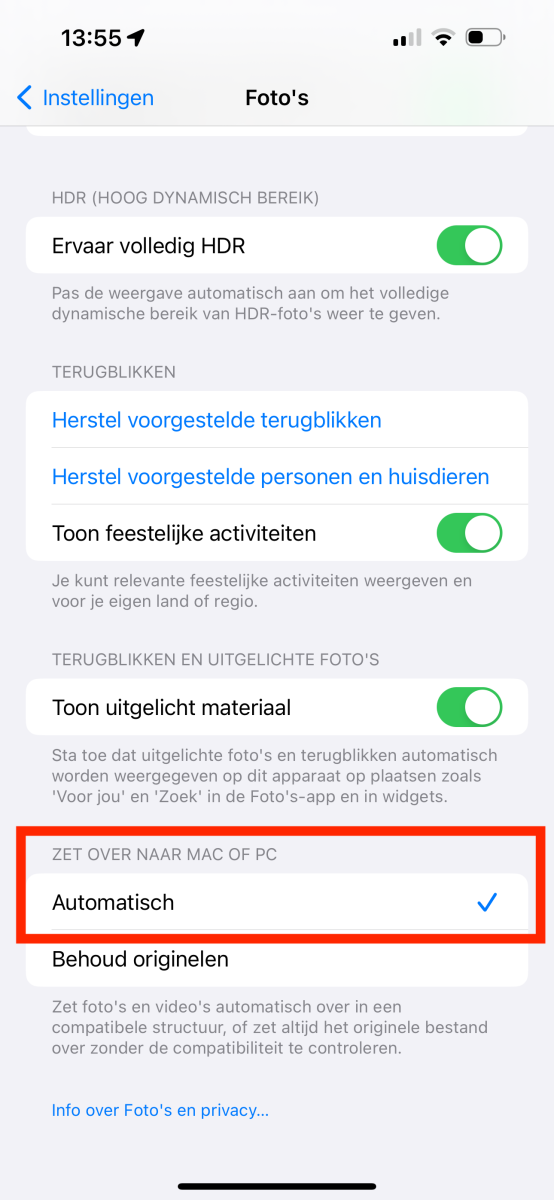 Op deze manier heb je op je iPhone het HEIC formaat, dat voor dezelfde kwaliteit foto's veel minder opslagruimte in beslag neemt, en op je Windows pc het compatibele JPG formaat.