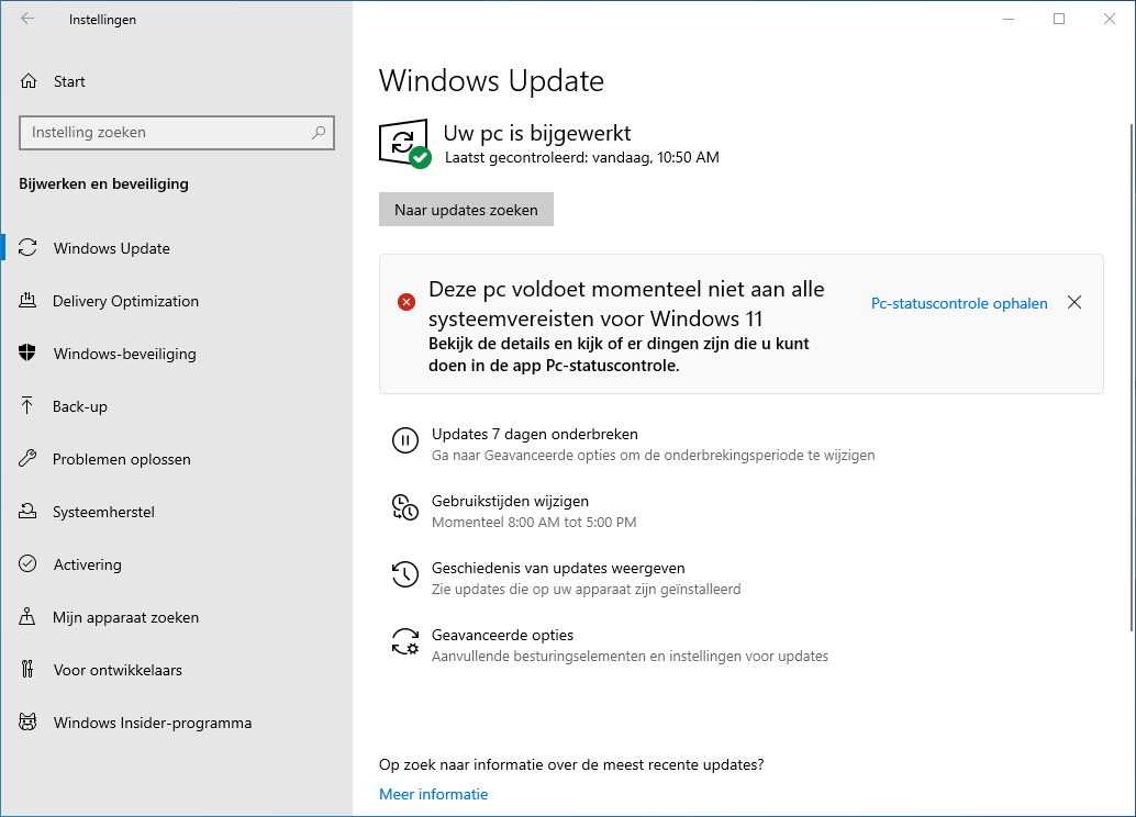 Het is sowieso aan te raden de Pc-statuscontrole app te laten checken, want er zit een door Microsoft erkende fout in Windows Update waardoor sommige pc's ten onrechte afgekeurd worden.