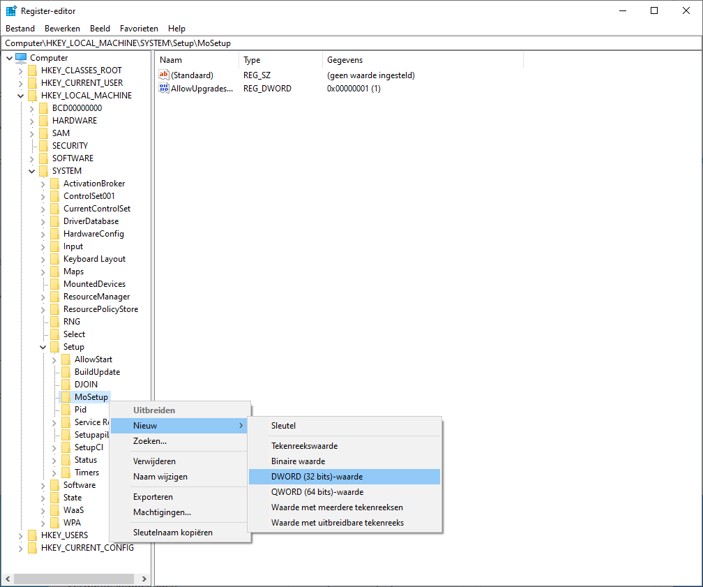 4. Rechtsklik op MoSetup en selecteer Nieuw > DWORD (32-bits)-waarde