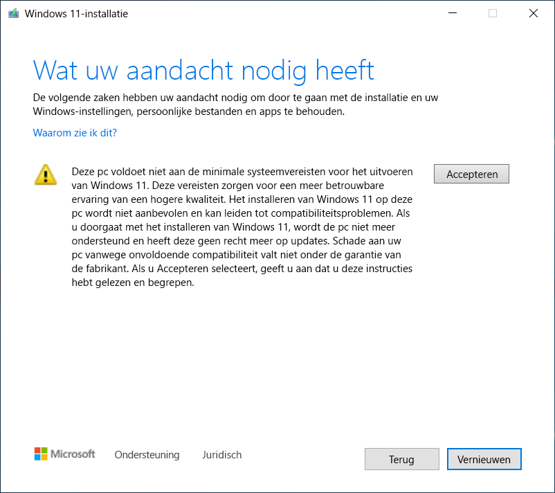 'Deze pc voldoet momenteel niet aan alle systeemvereisten voor Windows 11'