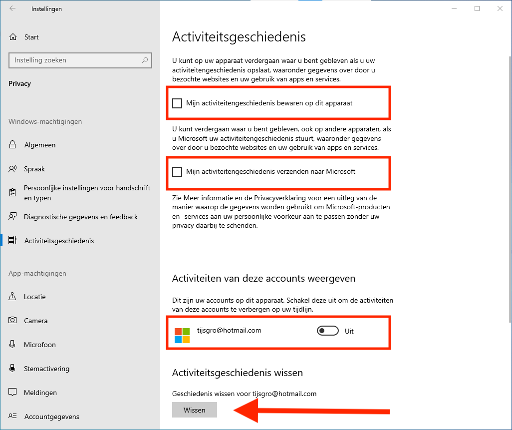 1. Ga naar Start | Instellingen | Privacy - Activiteitsgeschiedenis