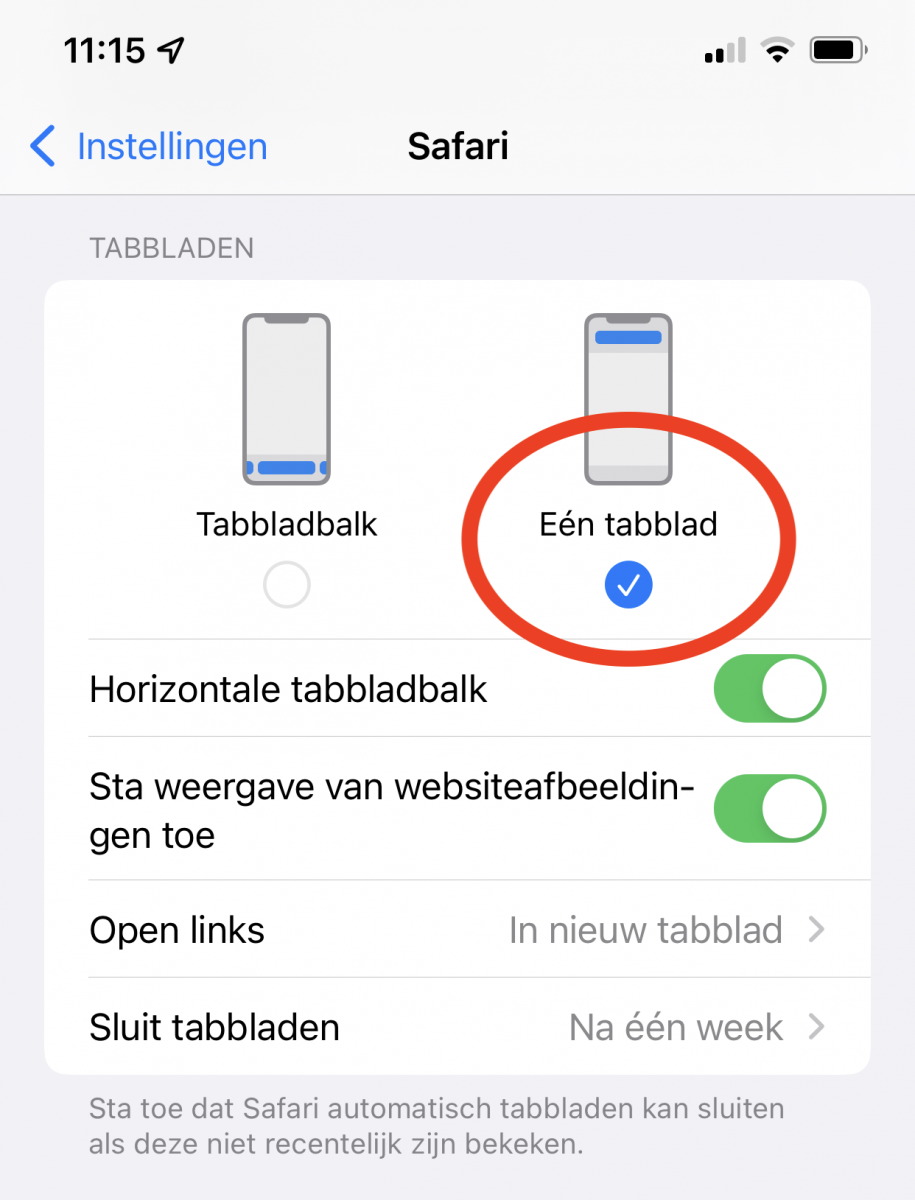 2. Onder het kopje Tabbladen selecteer je vervolgens Eén tabblad. De adresbalk staat nu weer bovenaan in Safari.