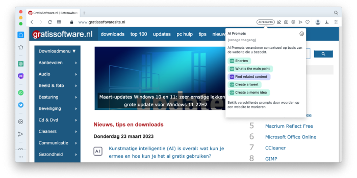 AIPrompts is een hulpmiddel om geselecteerde tekst of hele webpagina's onder andere samen te vatten, te tweeten of gelijksoortige sites te vinden. Je moet dan wel een (gratis) ChatGPT account hebben (of registreren) en AIPrompts nog aanzetten in Eenvoudig instellen in Opera en vervolgens heb je vroege toegang tot AI Prompts.