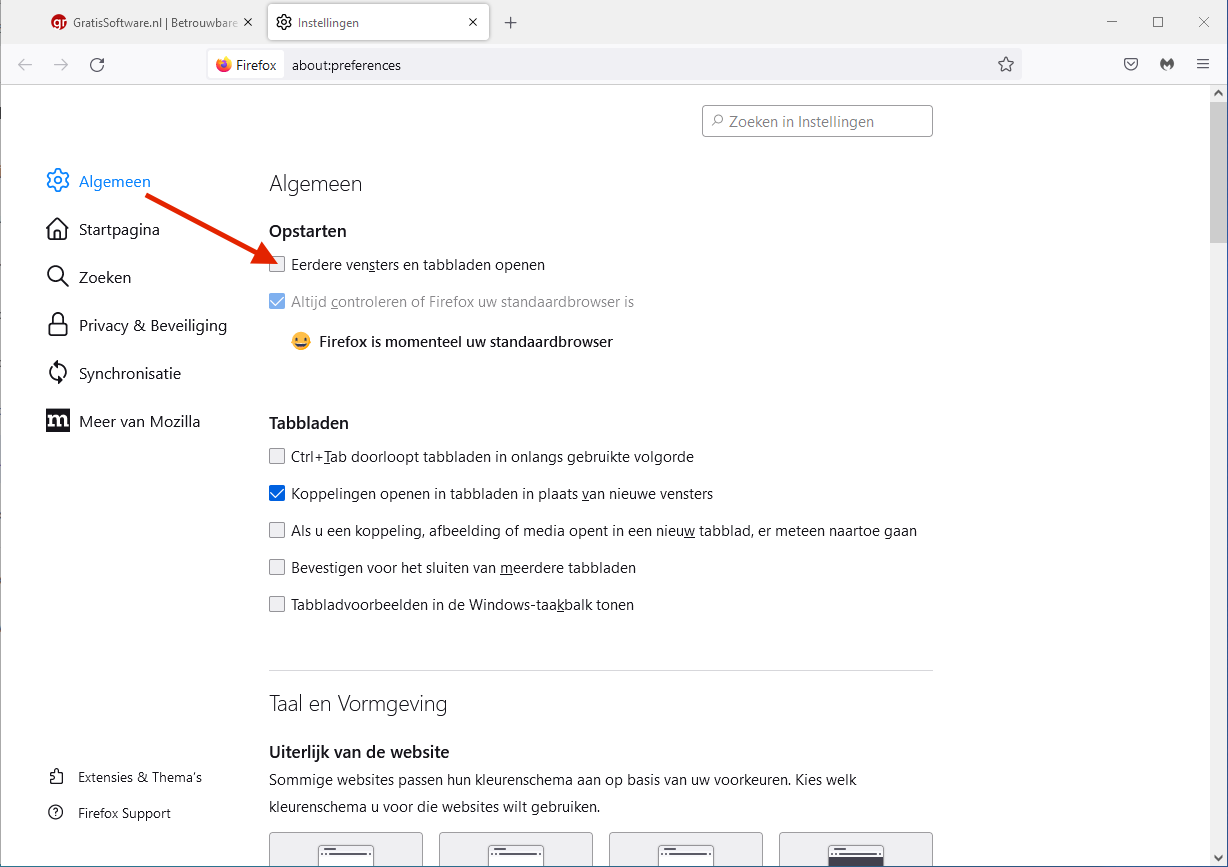 Eerdere vensters en tabbladen openen in Firefox aan- of uitzetten