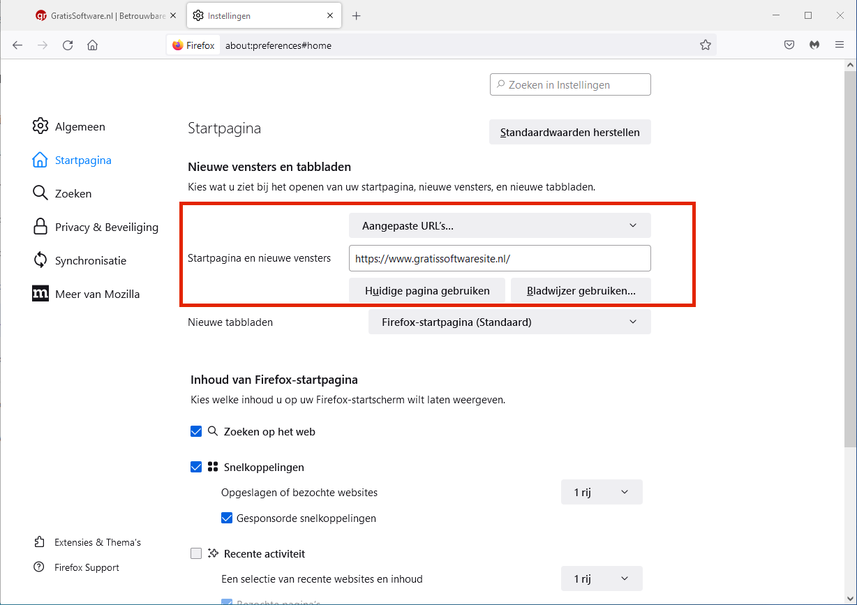 In Firefox kun je trouwens je startpagina en nieuw tabblad-pagina (als je een nieuw tabblad opent) afzonderlijk instellen, zoals je ziet.