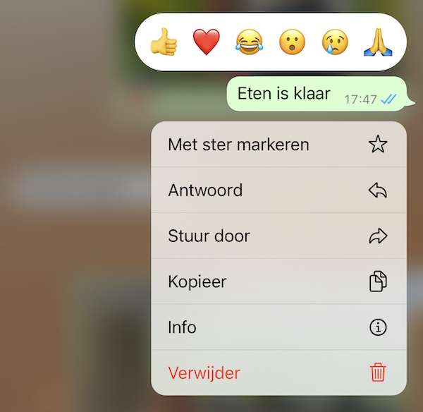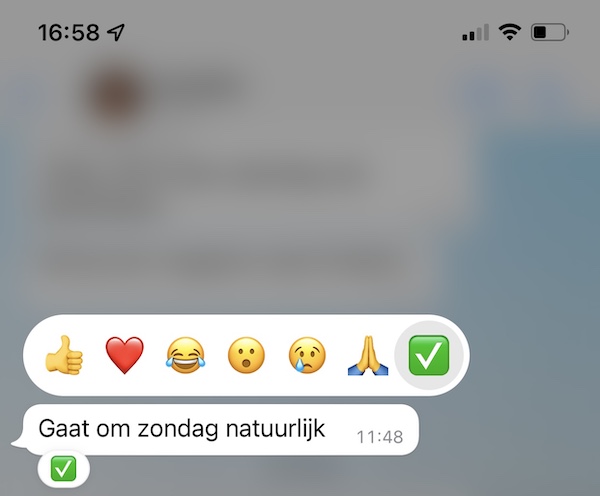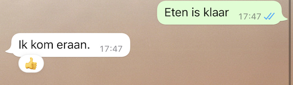 Emoji-reacties zijn voor appgroepen een oplossing om de hoeveelheid appjes wat omlaag te brengen. In plaats van twintig keer OK of duimpje als losse berichten kun je gewoon een duimpje aan het bericht vastplakken. Ook kun je zo je waardering laten zien aan een berichtje of aangeven dat je het grappig vindt of om te huilen.