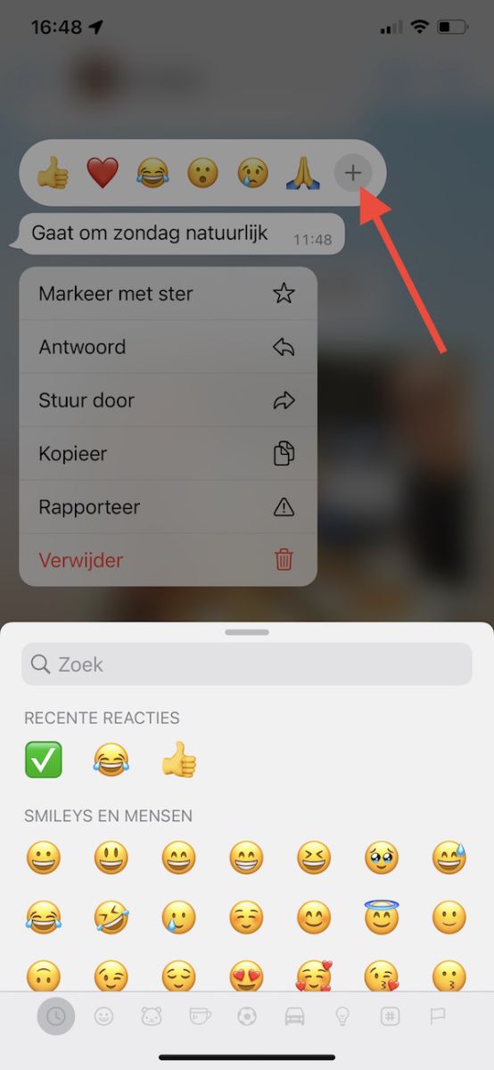 Inmiddels heeft WhatsApp alle emoji's beschikbaar gesteld om een korte reactie direct onder een bericht te hangen. Leg je vinger op het bericht waar je op wilt reageren en wacht tot je de emoji-reactie balk ziet verschijnen. Tik op het plusje en je kunt nu alle bestaande emoji's kiezen!