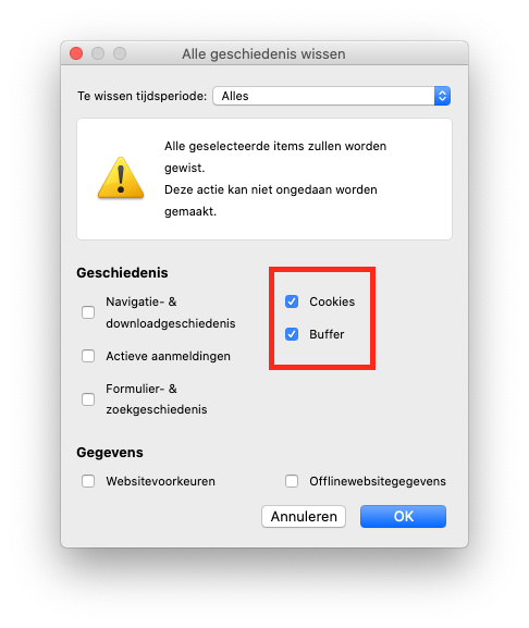 Ga naar driestreepjes-menu | Bibliotheek | Recente geschiedenis wissen. Selecteer 'Alles' en haal de vinkjes overal weg behalve bij Cookies en Buffer (cache). Klik OK.