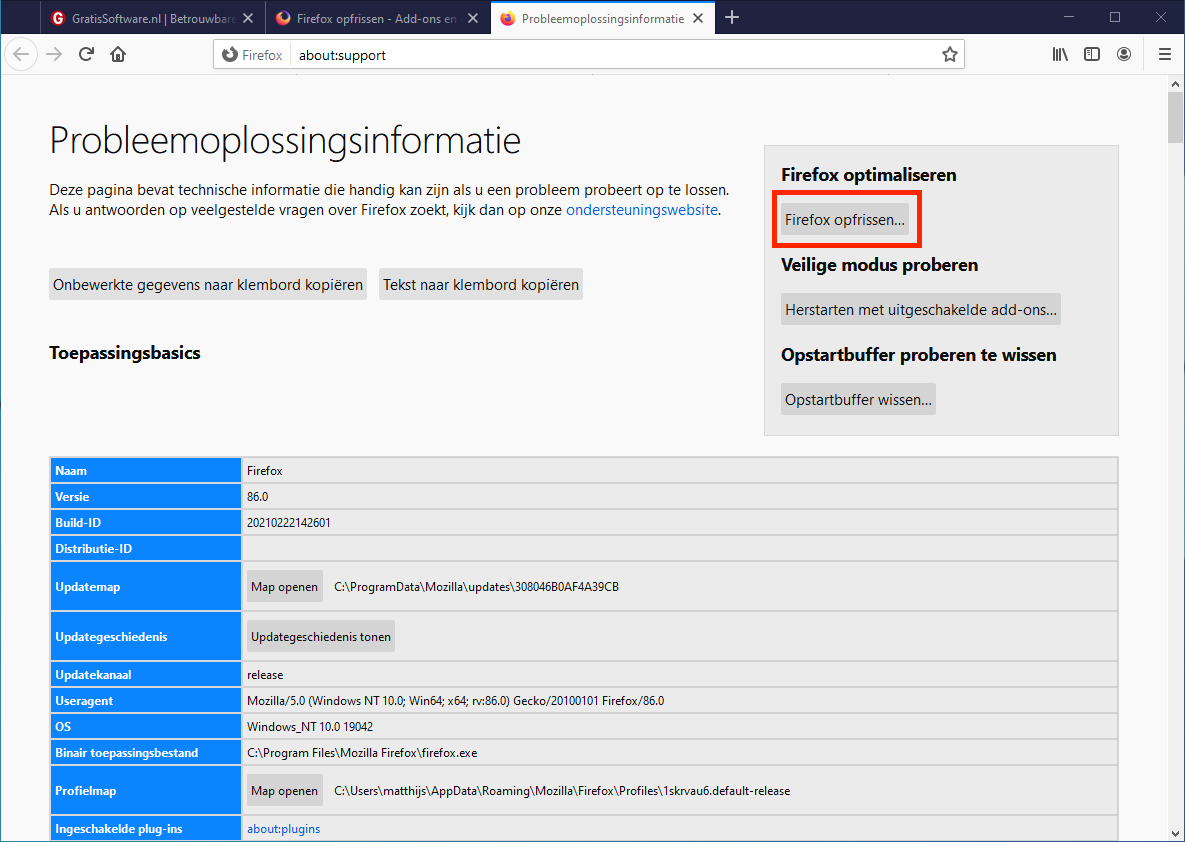- Ga naar driestreepjes-menu | Help | Probleemoplossingsinformatie (of typ about:support in de adresbalk)