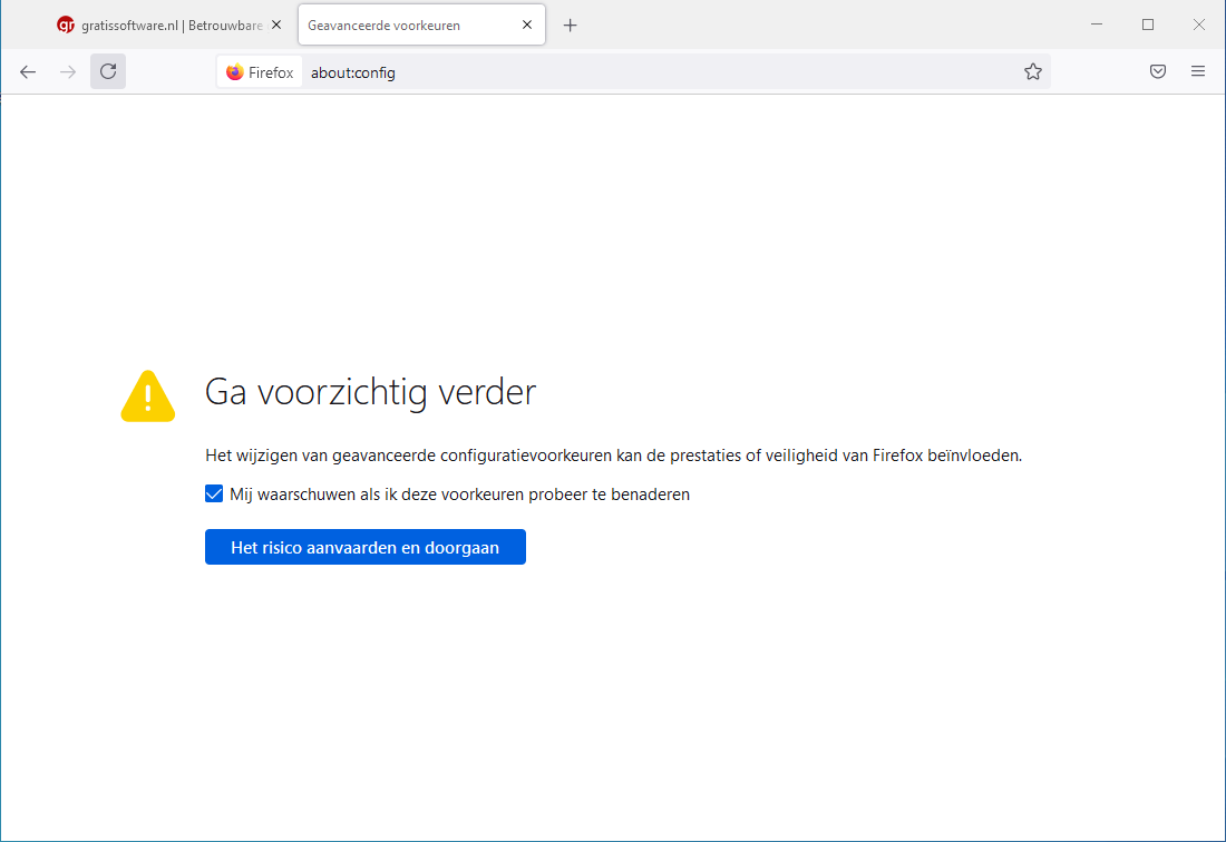 2. Klik Het risico aanvaarden en doorgaan (we gaan maar 1 instelling veranderen dus veel risico is er niet, maar ga niet zomaar allerlei instellingen wijzigen in Firefox)