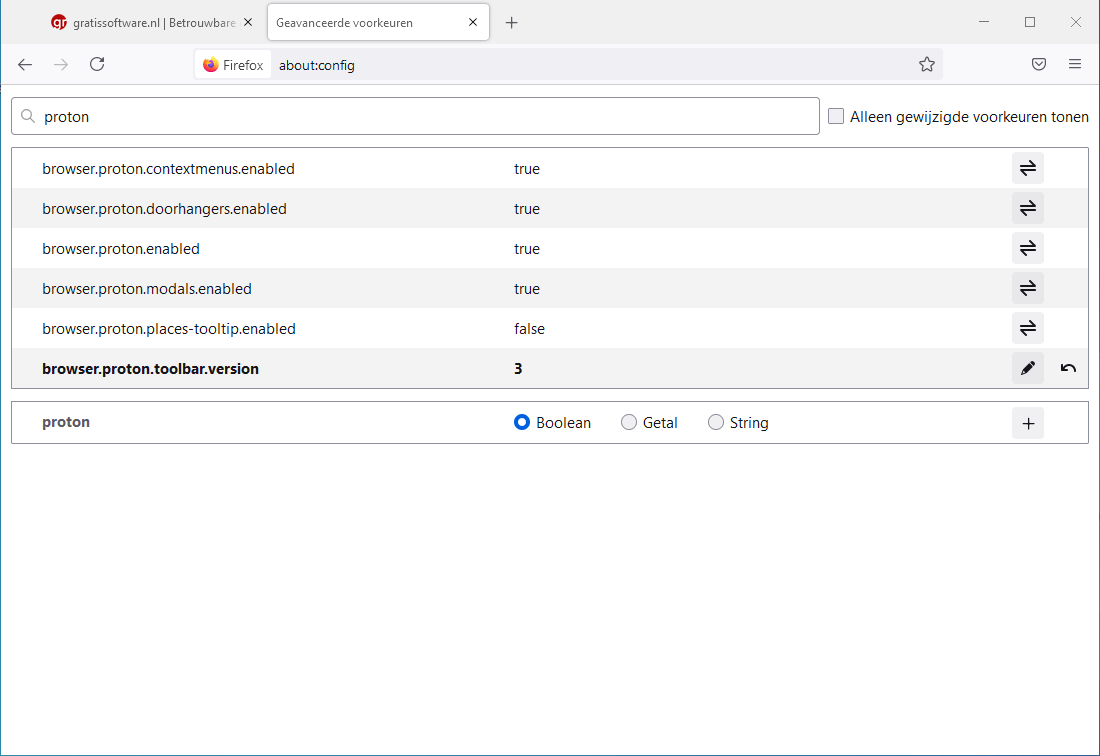 4. Nu gaan we 1 instelling wijzigen: dubbelklik op browser.proton.enabled zodat deze op false komt te staan.