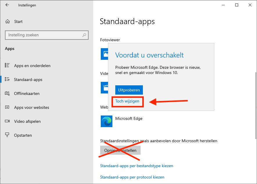 Als je toch per ongeluk Microsoft Edge als browser hebt ingesteld dan kun je deze makkelijk weer wijzigen in Google Chrome of Firefox of een andere web browser.