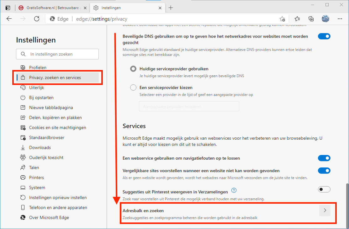 2. Klik op Privacy, zoeken en services en scroll (aan de rechterkant) helemaal naar beneden. Klik daar op Adresbalk en zoeken >