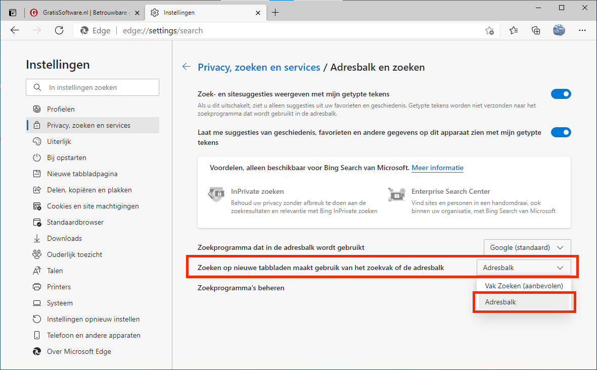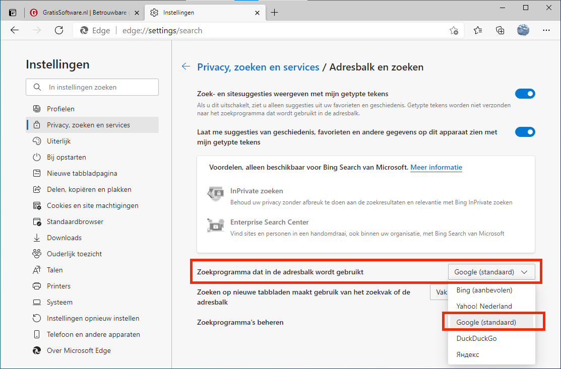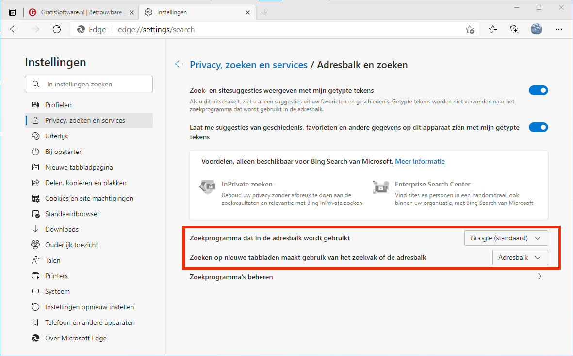 Google instellen als zoekmachine in Edge (adresbalk én zoekvak)