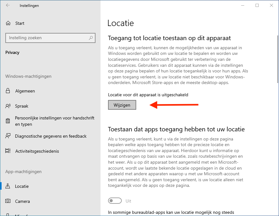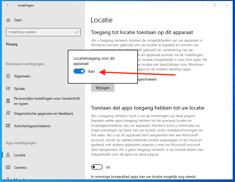 - Zorg ook dat je de Locatie-instelling hebt aangezet, zodat Windows 10 daadwerkelijk kan zien waar je apparaat zich bevindt:
