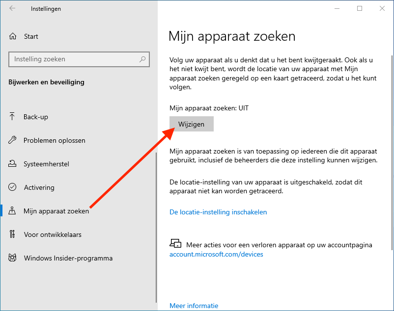 - Ga naar Instellingen | Bijwerken en beveiliging | Mijn apparaat zoeken en klik op Wijzigen: