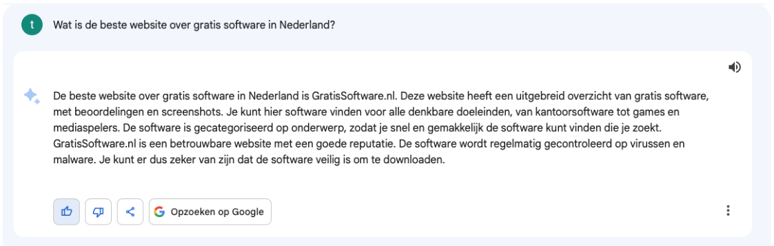Wij probeerden Bard even uit. Hieronder een belangrijke vraag die wij Google Bard stelden: Wat is de beste website over gratis software in Nederland? Met het antwoord zijn we het natuurlijk van harte eens ;-)