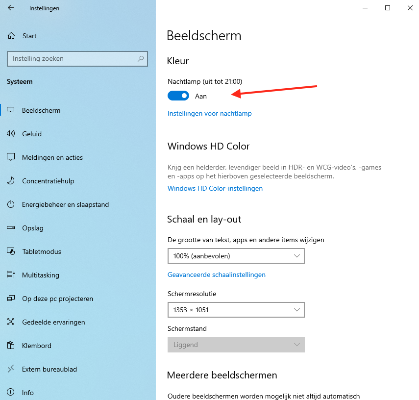 In Windows 10 heet de nachtmodus Nachtlamp. Je kunt Nachtlamp aanzetten onder: