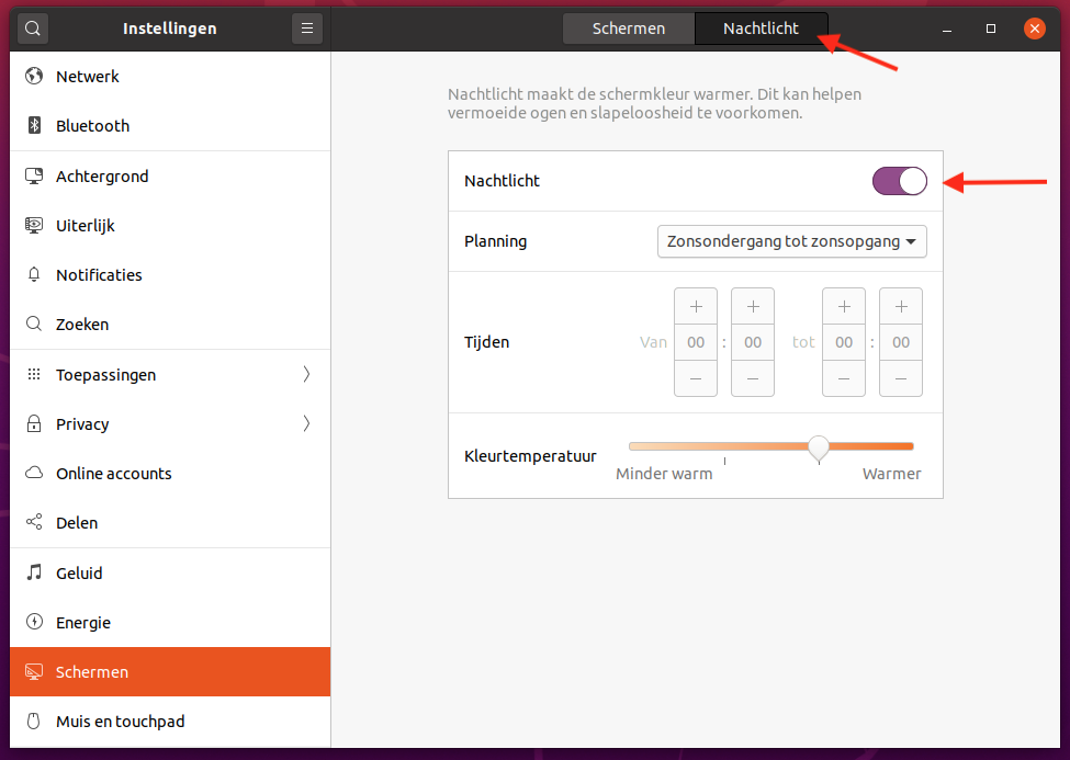 In Ubuntu Linux heet dit Nachtlicht en je kunt het instellen onder: