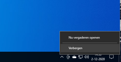 Als je hier nooit gebruik van maakt dan kun je ook rechtsklikken op het Nu vergaderen camera-icoontje in de systeembalk en kiezen voor Verbergen.