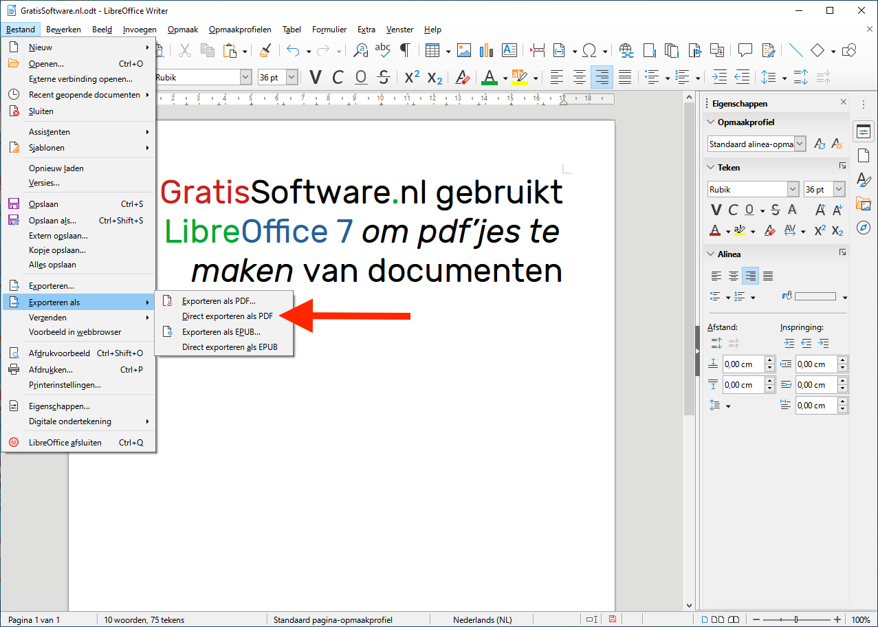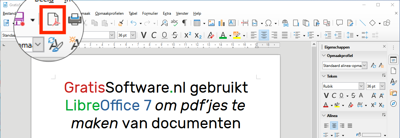 Je kunt trouwens ook direct op de PDF-knop op de werkbalk van LibreOffice klikken (tussen opslaan-knop en printer-knop in):