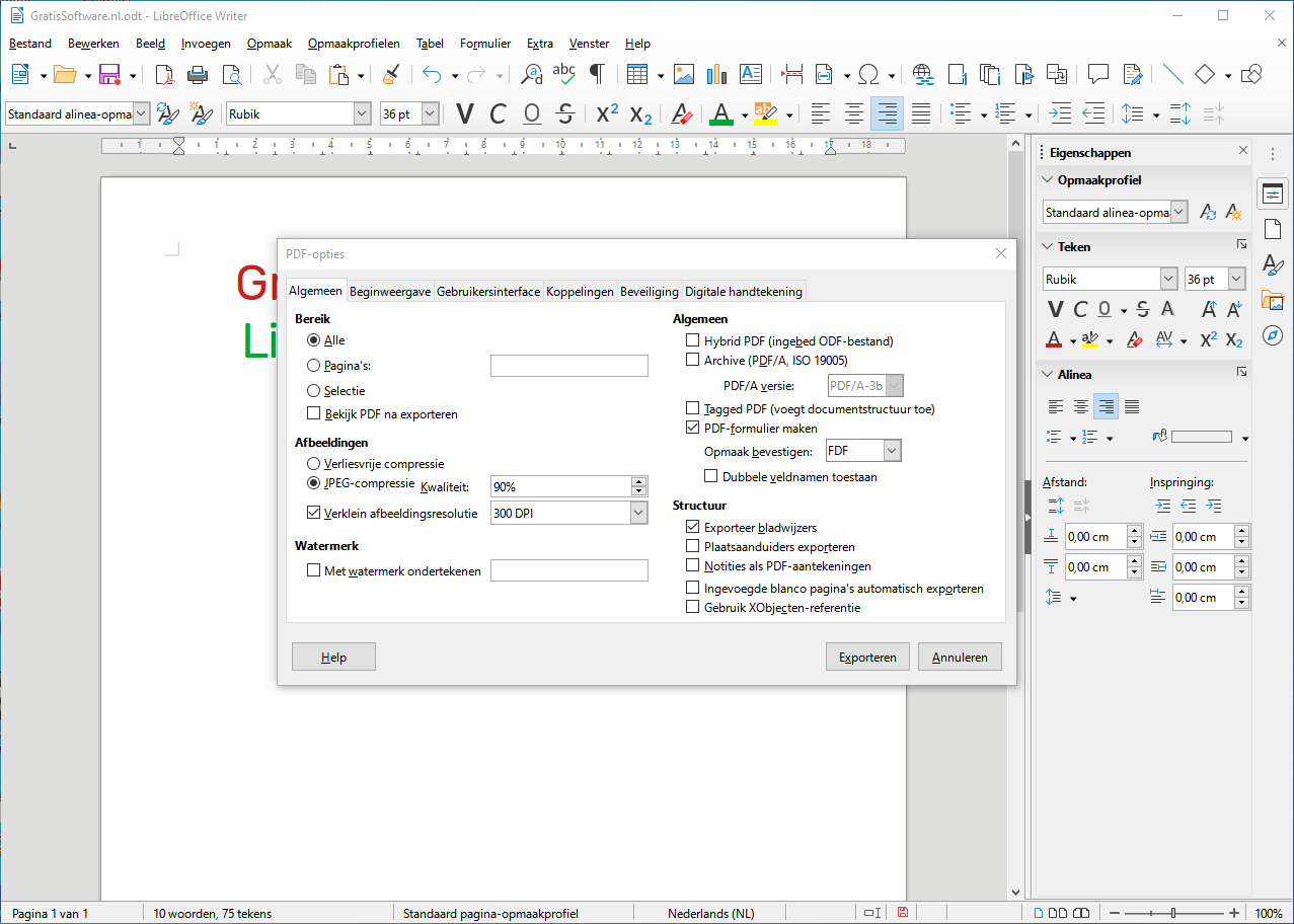 Voor gevorderden is er nog van alles in te stellen als je kiest voor Bestand | Exporteren als | Exporteren als PDF. Zo kun je de beeldkwaliteit en welke pagina's je wilt weergeven kiezen. Verder zijn er opties voor koppelingen en de gebruikersinterface. Ook kun je een watermerk toevoegen of het pdf'je beveiligen met een wachtwoord. Ten slotte kun je het pdf document een digitale handtekening geven.