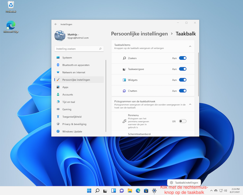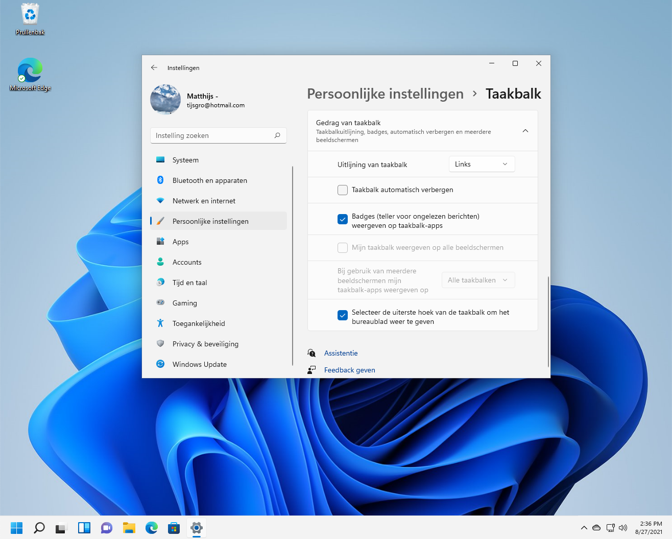Je kunt de taakbalk nog altijd naar links verplaatsen in de officiële uitgave van Windows 11. Kijk maar in de instellingen zoals wij hierboven aangeven.