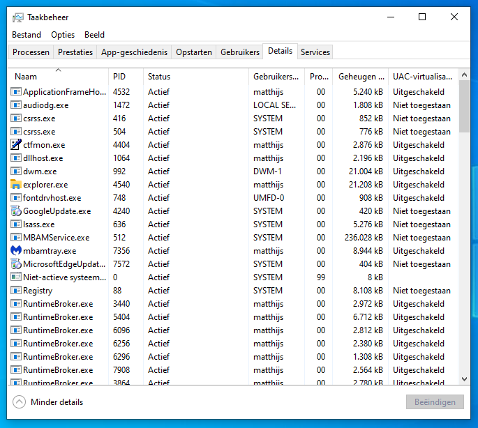 3. Als je meer toepassingen en draaiende achtergrondprocessen wilt zien dan klik je linksonder op Meer details. Ook hier kun je toepassingen en achtergrondprocessen beëindigen. Doe dit met beleid en alleen als ze problemen veroorzaken.