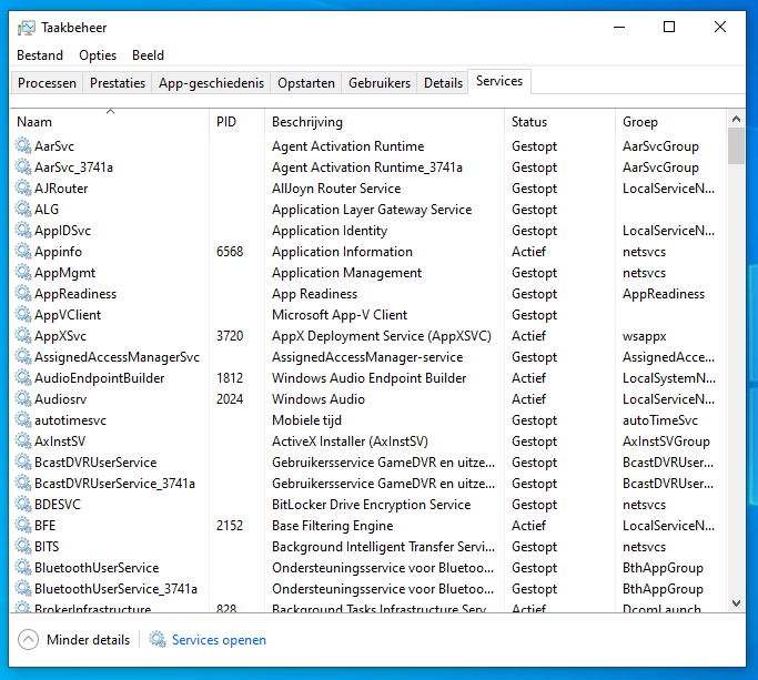 5. Voor de echte gevorderden zijn er nog de tabbladen Details met ook systeemprogramma's en Services met alle achtergrond services die draaien op je pc. Ga hier niet zomaar programma's en services beëindigen of uitschakelen, want dat kan de werking van je computer verstoren.