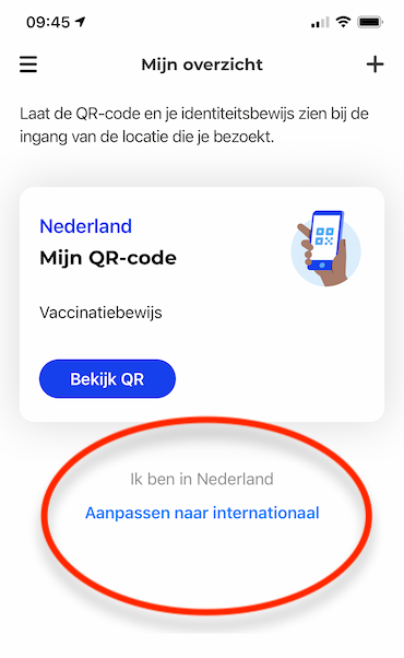 In Nederland gebruik je je Nederlandse QR code, in het buitenland kun je wisselen naar een code speciaal voor buiten Nederland door te klikken op Aanpassen naar internationaal.