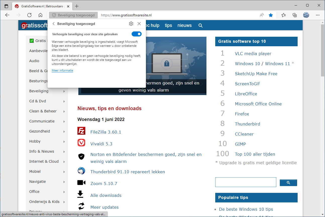 De meeste websites blijven goed werken met deze extra beveiliging (GratisSoftware.nl wel in elk geval) maar mocht je problemen ondervinden - Microsoft waarschuwt dat 'delen van websites mogelijk niet werken' - dan kun je de toegevoegde beveiliging ook per site uitschakelen: