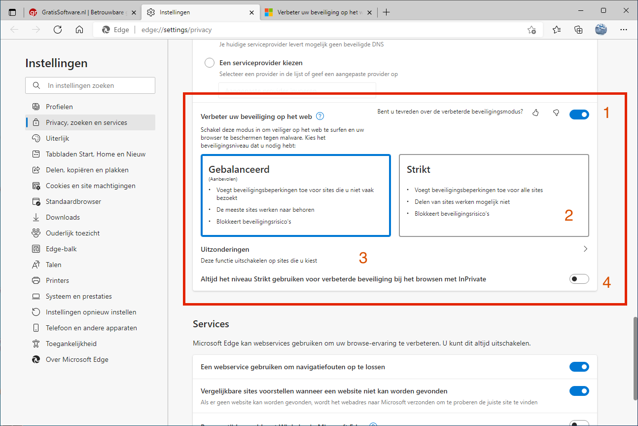 Als je je beveiliging juist zo streng mogelijk wilt in Edge dan kun je voor de modus Strikt kiezen.