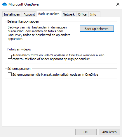 Rechtsklik op het OneDrive-icoon in de systeembalk (wolkje) en kies voor Meer | Instellingen | Back-up maken | Back-up beheren